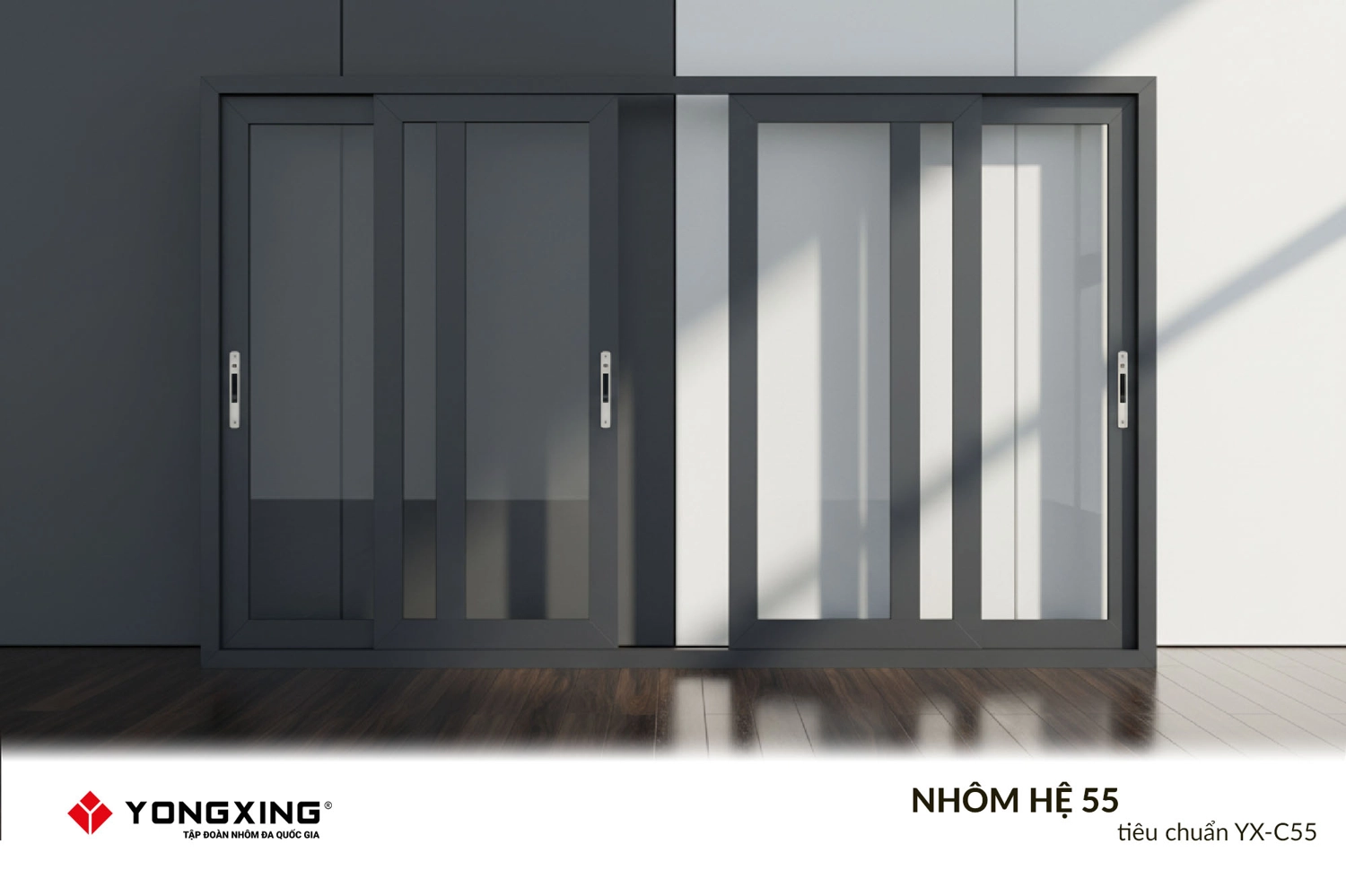 Đây là dòng sản phẩm "quốc dân" của nhôm hệ 55 với sự đa dạng bậc nhất về độ dày (1.2mm, 1.4mm, 2.0mm), màu sắc (Café, Trắng, Xám nhũ bạc, Champagne V8) và thiết kế (có gân/không gân). YX-C55 sử dụng khung bao riêng biệt, tối ưu hóa cho từng chức năng (cửa đi, cửa sổ), mang lại độ kín khít và chắc chắn tuyệt đối.