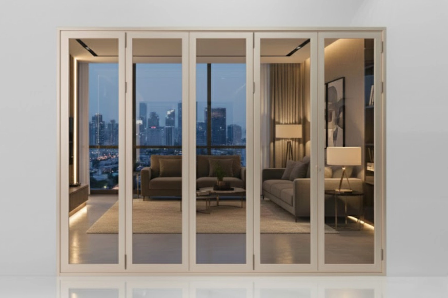 Hệ thống 5 cánh xếp trượt linh hoạt: Cho phép mở rộng hoàn toàn khẩu độ cửa, tận dụng tối đa ánh sáng tự nhiên và tầm nhìn